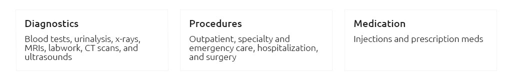 - Medications and diagnostics: labs, x-rays, ultrasound; sometimes exam fees too.